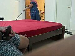 The tamil maid sneaks in a cucumber for her pussy while the owner watches nearby.