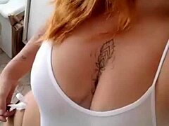 Redhead Siri plays with a huge dildo outdoors in the sunny weather, showcasing her natural tits.