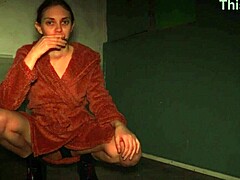 After cumming hard, the hot 18-year-old brunette relaxes by smoking a cigarette and listening to music.