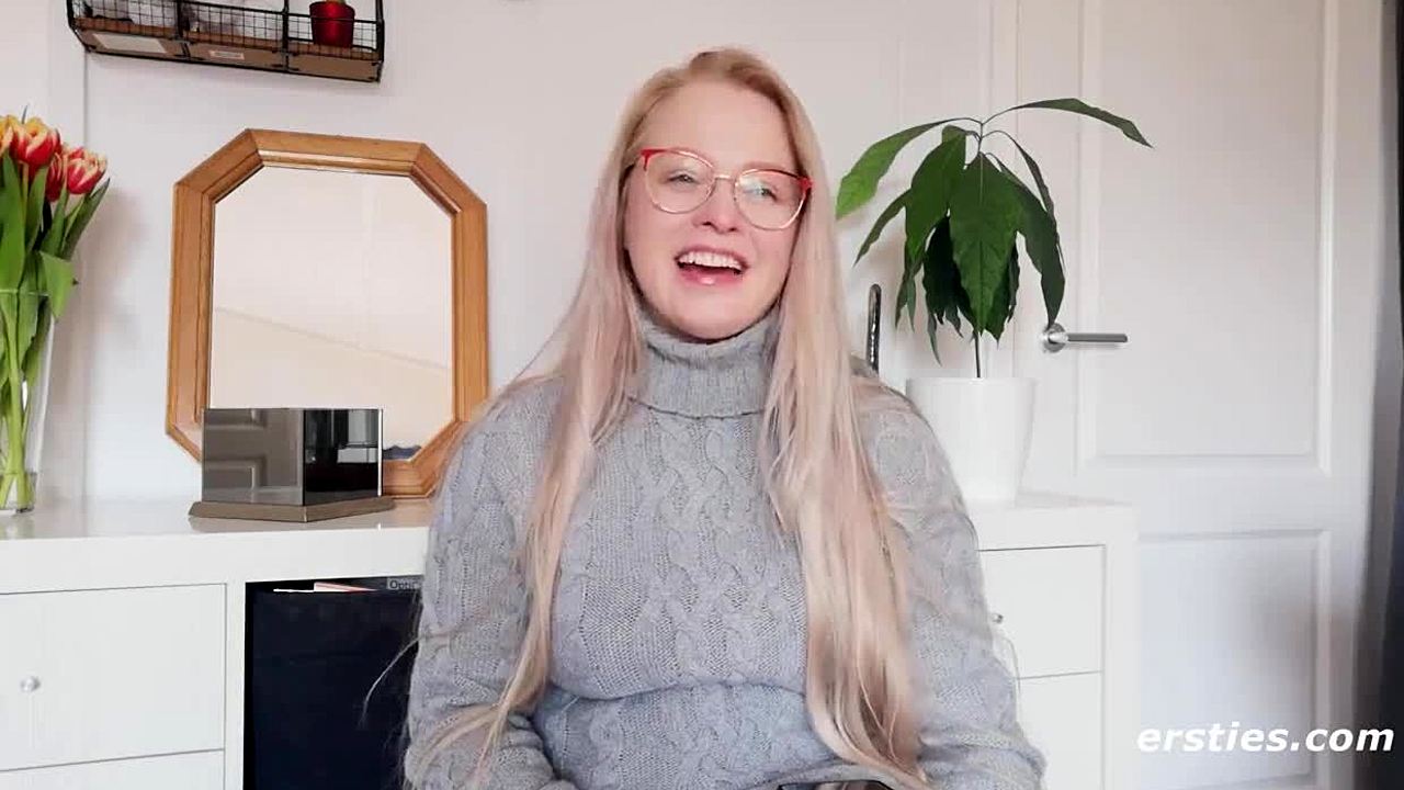 Ersties cute blonde Anna with glasses fingers her wet pussy to squirting orgasm using dildo