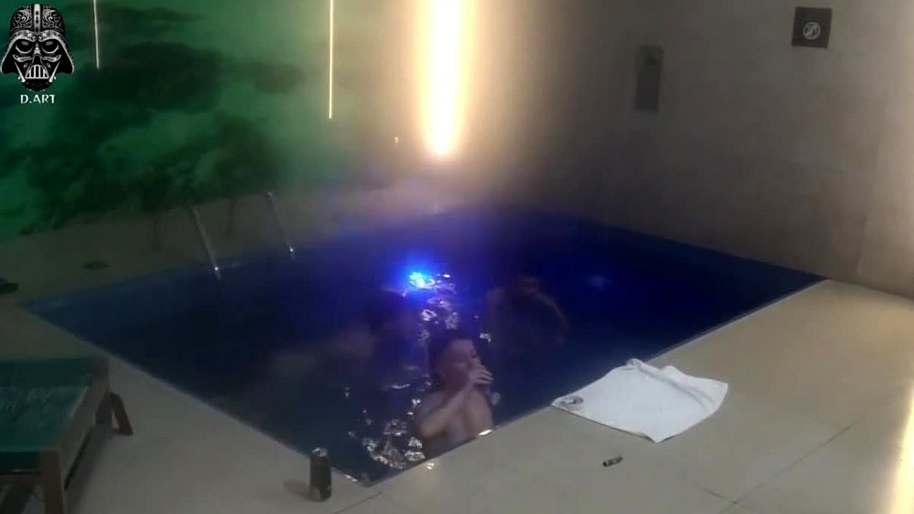 Inked blonde teen enjoys a relaxing swim with grandpa in the outdoor pool