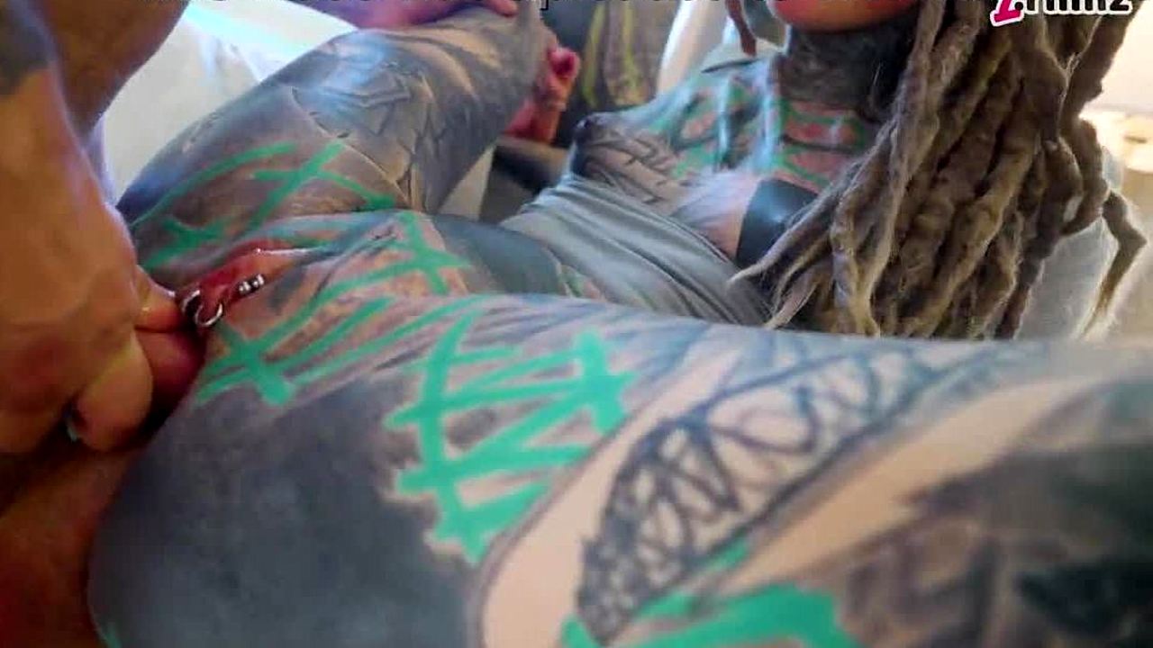 Tattooed babe takes double penetration in doggystyle and cowgirl threeway fuck.