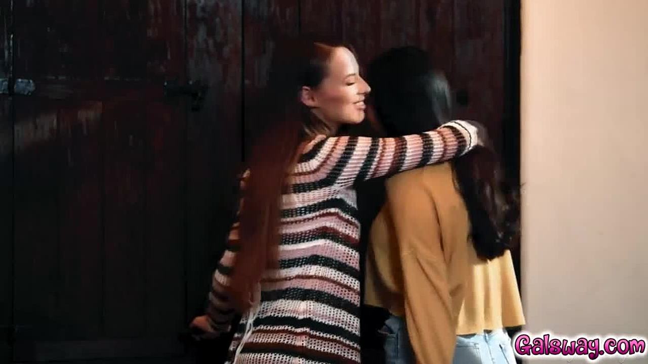 Two skinny Latina lesbians suck big white cock, squirting first time